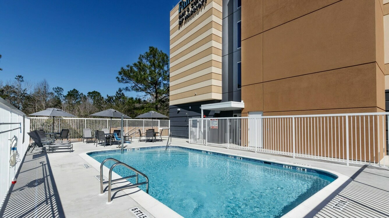 Fairfield Inn and Suites Crestview is directly off Interstate 10 and next door to Chick-fil-A. Perfect for corporate business travelers, government travelers and leisure guests. Start your day with a hot breakfast buffet with healthy choices. Our hotel in Crestview, FL's lobby has cozy couches and tables perfect to gather and plan or conclude a day of fun or business. The on-site fitness center has everything you need to keep your fitness routine. Cardio, free weights and yoga equipment are available 24 hours with key access. Enjoy the sparkling outdoor pool and patio area with an accessible lift. Two meeting rooms with state of the art tables and chairs, a pull down screen and large TV for projection. The meeting/banquet rooms can accommodate up to 50 people for business meetings and social gatherings. Book your stay today at our hotel near Crestview FL.
